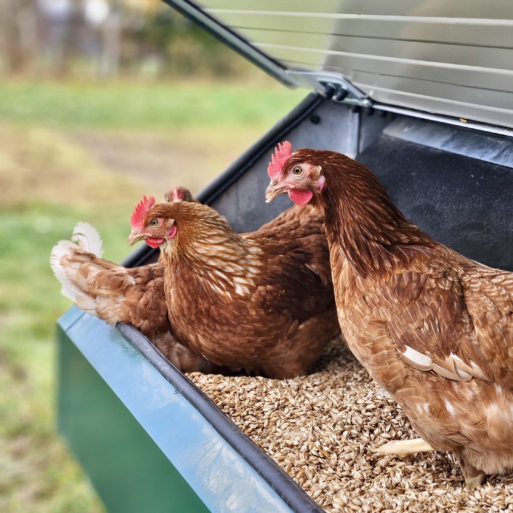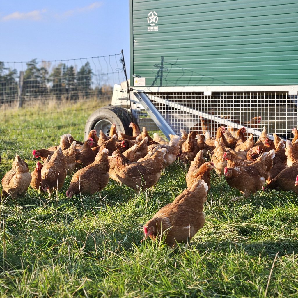 Naše slepice žijí celoročně na pastvině, po které pravidelně posouváme moderní mobilní kurník s čistou pitnou vodou a krmením. Slepice tak mají bezpečné a pohodlné zázemí pro nocování i snůšku vajec.